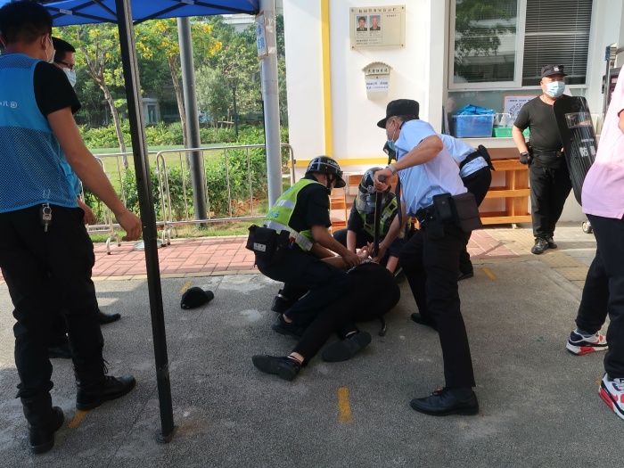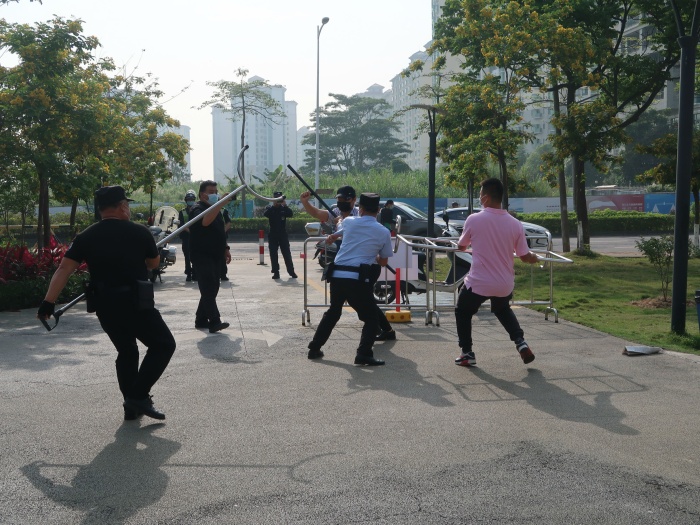此次演練在全園幼兒和教師中展開,在駐校民警協助指導下,由安保公司人員假扮“歹徒”并手持兇器強行翻墻進入幼兒園。幼兒園保安隊發現異常情況后立即啟動報警系統,并采取有針對性防暴力事件的各種措施,拿起鋼叉、鐵棍等勇敢地與“歹徒”進行搏斗。各班老師組織正在操場上游戲的小朋友快速有序地就近疏散、避險。最后“歹徒”在教師及保安人員的齊心協力下被成功制服,此次演練進行得十分順利。演練后各班老師在安撫幼兒情緒的同時對幼兒進行了安全教育。
