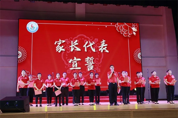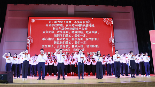 “紅星閃閃放光彩,紅星燦燦暖胸懷,紅星是咱工農的心,黨的光輝照萬代……”誓師盛典以一首合唱《紅星伴我成長》拉開序幕,伴隨著激昂的旋律,校合唱團的同學們深情歌唱,向在場師生們歌唱作為新時代青少年需傳承好黨的光輝基因,未來需肩負起的責任和使命。從此刻起,不負光陰,不負韶華,以夢為馬,為迎戰中考立下錚錚誓言。