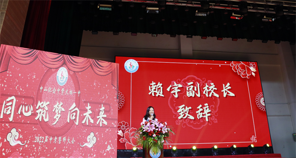 賴宇副校長作《我的主場我做主》主題講話。她回顧了2022屆火炬一中學子三年來創造的奇跡:生地中考的開門紅,市籃球賽的雙冠軍、學科競賽大豐收等。回想去年集體觀看建黨一百周年的盛典,發出莊嚴誓言:請黨放心,強國有我!感動于這份家國情懷令同學們走向詩與遠方。站在距離中考沖刺終點不到百米之遙的賽道上,賴宇副校長給同學們送去祝福:愿同學們心懷夢想,全力以赴。希望全體初三學子做到心中有夢想,肩上有責任,腳下有力量,你若向上,家國向前!愿同學們珍惜當下,只爭朝夕新冠疫情下,我們感受到了個人的渺小,生命的無常,但更讓我們懂得感恩和珍惜身邊的美好。愿同學們堅持到底,奮斗不息在初中最后的階段,以奮斗拼搏的姿態和戰無不勝的信心,全力以赴迎接這一場逐夢之戰。
