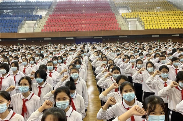 校黨總支副書記、副校長、初二年級校長吳志剛在講話中用“五顆心”與同學們共勉。他希望大家要有堅定的信心、取勝的決心、持久的恒心、入微的細心、篤定的苦心。為夢想,一起拼。拼搏改變一切,一切皆有可能。在全體行政、生地教師、班主任領誓下,全體同學舉起右手,握緊拳頭,以青春的名義宣誓。