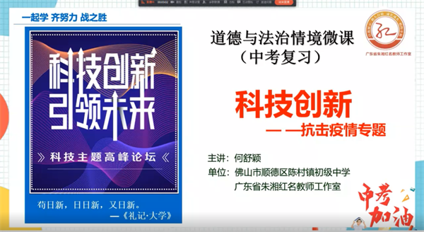 最后,兩校思政教師共同在線觀摩了何舒穎老師主講的微課《科技創新》,何舒穎老師于2016年獲得廣東省思想品德和道德與法治優質課比賽活動現場授課、說課及綜合總分“特等獎”。