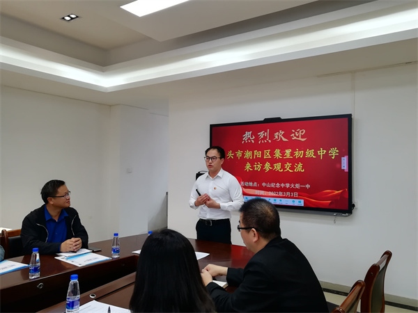 為落實世行貸款項目,推進全省義務教育均衡優質標準化發展,中山紀念中學火炬一中作為支援學校,與受援學校汕頭市潮陽區集星初級中學結對,指導結對學校開展幫扶工作。3月3日,汕頭市潮陽區集星初中行政一行6人,在校長翁松標的帶領下,到火炬一中就接下來的幫扶工作進行深入交流。