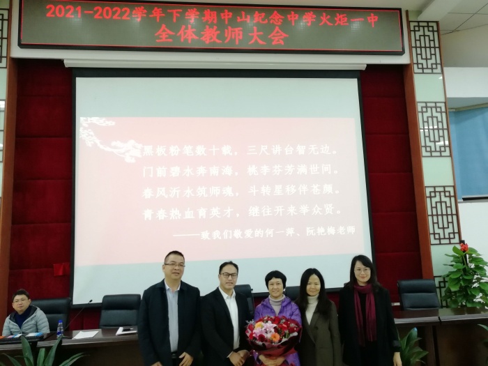 接著,舉行了情深意切的歡送退休教師儀式。校黨總支書記、副校長程煒敏向何一萍、阮艷梅兩位退休教師獻上鮮花。四位校領導分別與兩位退休教師合影留念。