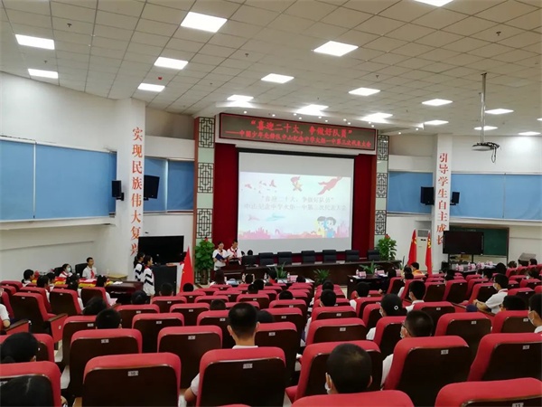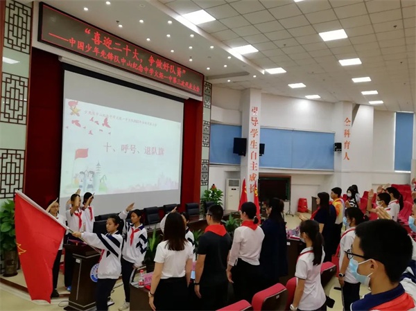 校黨總支書記、少工委主任程煒敏致辭。在慶祝中國共產黨成立100周年大會上,共青團員、少先隊員代表響亮喊出“請黨放心、強國有我”的青春誓言。他認為這是新時代中國青少年應該有的樣子,更是黨的青年組織必須有的風貌。青年追求政治進步的“人生三部曲”。共青團要履行好全團帶隊政治責任,規范和加強少先隊推優入團工作機制,著力推動黨、團、隊育人鏈條相銜接、相貫通,確保紅色江山永不變色。廣大少先隊員要早立志、立大志,從內心深處厚植對黨的信賴、對中國特色社會主義的信心、對馬克思主義的信仰,努力做“理想遠大、信念堅定,刻苦學習、銳意創新,敢于斗爭、善于斗爭,艱苦奮斗、無私奉獻,崇德向善、嚴守紀律”的模范,努力成長為一名合格的社會主義建設者和接班人,以實際行動喜迎黨的二十大勝利召開,爭做新時代強國好隊員,不負韶華,不負黨、祖國和人民的殷切期待!