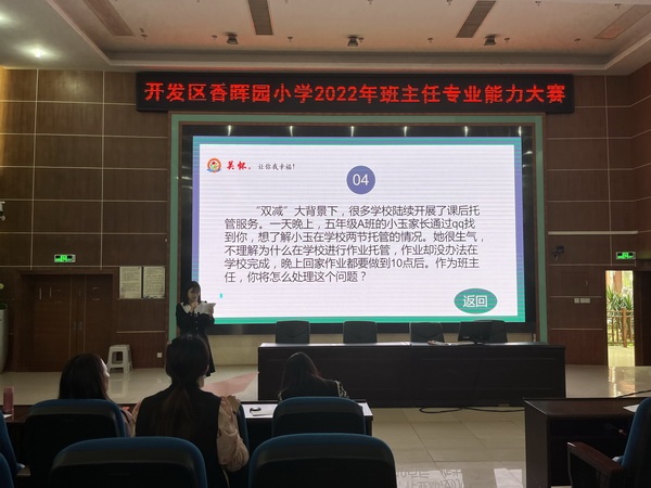 第二環節情景答辯,由不參賽的班主任根據熱點話題或班級管理中遇到的情境出題,題目貼近班主任工作實際,引起了參賽選手和在場教師的深思。答辯現場掌聲不斷,選手們對案例進行了科學分析、精準判斷,不僅對問題的起因進行了分析,同時給出了解決問題的思路、對策。