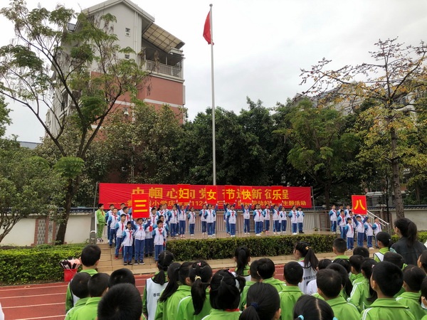 活動當天,在莊嚴的升旗儀式后,三(6)中隊在中隊輔導員黃麗娜的帶領下獻上了主題演出。隊員們衣裳楚楚,配合整齊劃一的動作,通過婉轉動聽的歌聲,訴說著對女教職工的祝福。隊員們高高舉起的標語“三八節日快樂”為表演畫上圓滿句號。