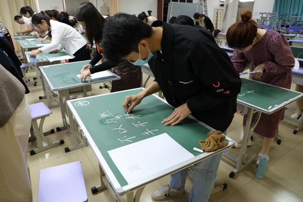 12月17日早上,開發區教育事務指導中心張立超老師帶來密封的試題,現場請參賽選手抽取拆封。接著馬上進行大賽的第一項——粉筆字書寫,要求選手在5分鐘內用粉筆字書寫四組詞語。只見選手們凝神屏氣、手腕旋動,筆下的字跡或娟秀端正,或遒勁有力,充分展示了語文教師扎實的書寫功底,領略了中華民族的漢字之美,引得觀摩老師紛紛拍照學習。
