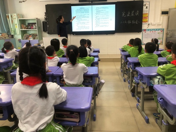 當日上午9:00,各班利用教室多媒體設備在教育部全國青少年普法網(wǎng)收看了憲法晨讀網(wǎng)絡直播。全體師生通過直播觀看了現(xiàn)場舉行的升旗儀式、憲法晨讀、北京主會場領唱《憲法伴我們成長》歌曲、優(yōu)秀學生現(xiàn)場展演、最高檢察院副檢察長講法治課等活動,深刻領會了憲法的含義。隨后,各班班主任帶領學生逐字逐句地朗讀《憲法晨讀》內(nèi)容。通過二十分鐘的朗讀,全校師生對憲法有了初步的認識,對憲法中的基本法律知識有了初步的了解。