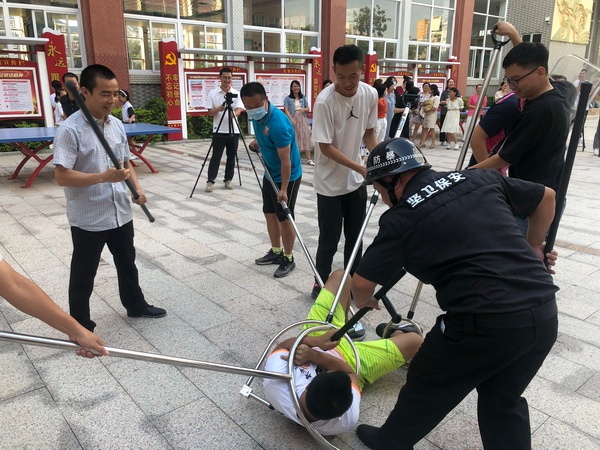 安保隊伍和男教師們就模擬有不明身份男子“襲擊”學校的情境展開演練。一名攜帶危險用品的男子欲強行進入校園進行施暴。學校安保隊伍和男教師們第一時間到位,使用防暴棍、防暴盾牌等工具將其成功制服。