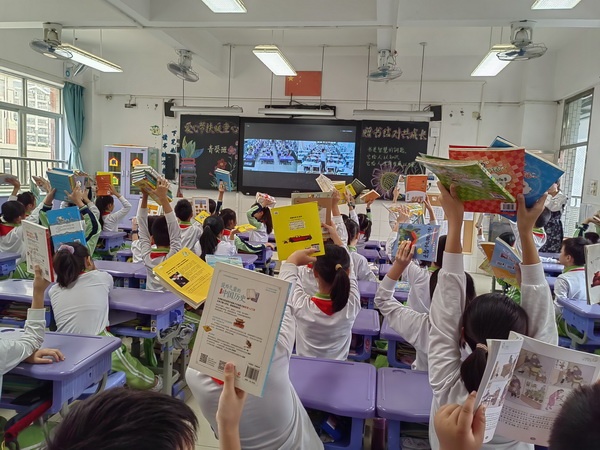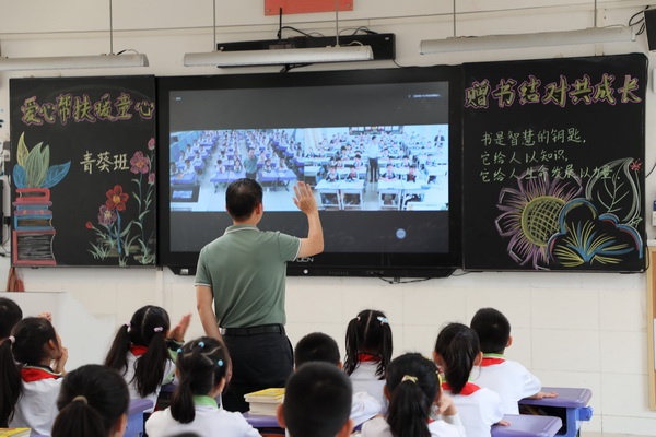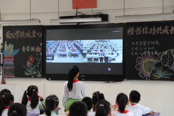 交流結束后,四(5)青葵班的劉梓萱同學還分享了自己的閱讀歷程與收獲,推薦了自己喜歡閱讀的書目,希望小伙伴們能在閱讀中找到快樂,在書中找到生命發展的力量。贈書儀式開始了,該班全體同學紛紛高舉自己捐贈的書籍,展示給遠方小伙伴們看,希望通過網絡傳遞出自己那一份誠摯的心意。