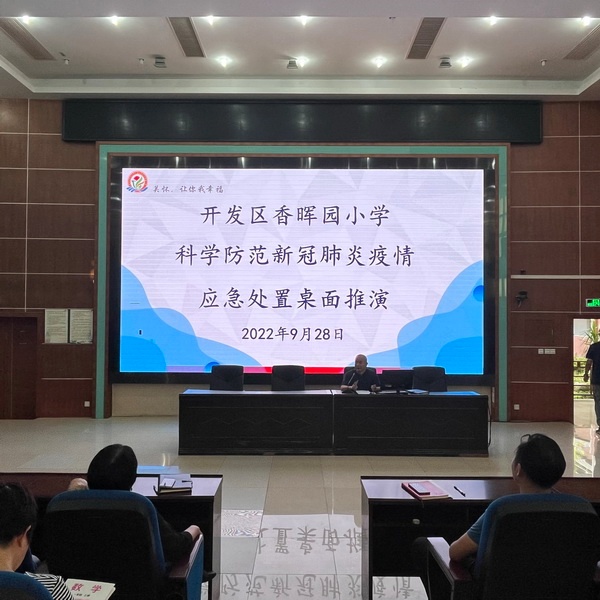 為防止學(xué)校發(fā)生大規(guī)模新冠肺炎疫情,落實(shí)“早發(fā)現(xiàn)、早診斷、早報(bào)告、早隔離、早治療”的防治原則,結(jié)合《廣東省教育廳關(guān)于做好學(xué)校新型冠狀病毒感染的肺炎疫情防控工作的緊急通知》要求,提高學(xué)校面對(duì)疫情的應(yīng)急處置能力,切實(shí)保障師生身體健康和生命安全。9月28日下午,開(kāi)發(fā)區(qū)香暉園小學(xué)在學(xué)校報(bào)告廳開(kāi)展了新冠肺炎疫情應(yīng)急處置桌面推演活動(dòng)。香暉園小學(xué)校長(zhǎng)歐陽(yáng)祝棣擔(dān)任現(xiàn)場(chǎng)總指揮,副校長(zhǎng)劉裕組織了推演,學(xué)校兼職健康副校長(zhǎng)、區(qū)疾控中心副主任醫(yī)師陳國(guó)禎和全體教職員工參加了活動(dòng)。