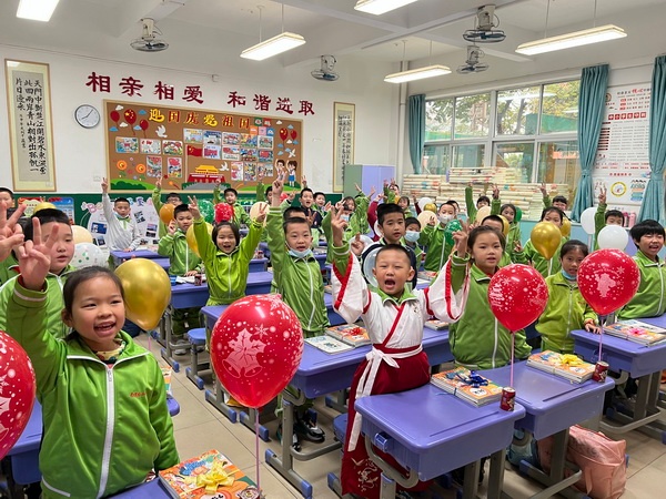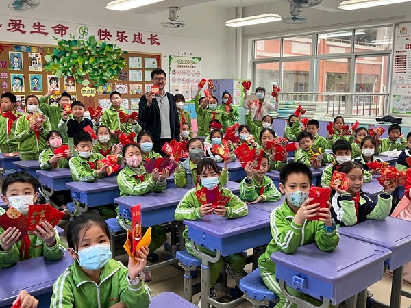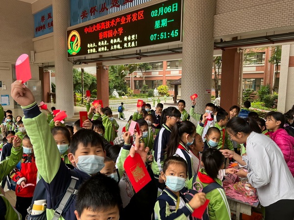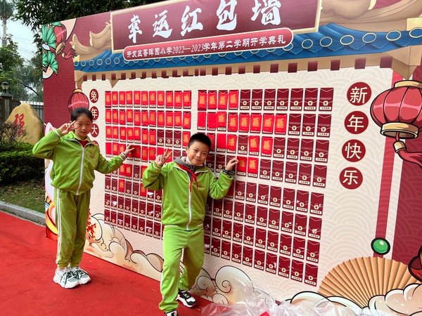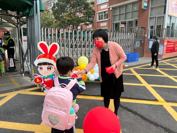 香小學子的開學第一天儀式感滿滿。學校行政在歐陽祝棣校長的帶領下,分別在學校西門和南門迎接同學們的到來,并通過“幸運紅包”將滿滿的祝福傳遞給同學們。同學們進入校門后跨過一個個“新春欄桿”,寓意在新的一年大展鴻“兔”、前“兔”無量?!靶疫\紅包墻”前,同學們紛紛領取“幸運紅包”并拍照打卡留念?!靶疫\紅包”內裝有獎券,同學們憑獎券可兌換糖果、文具等禮物,兌獎處場面火爆。