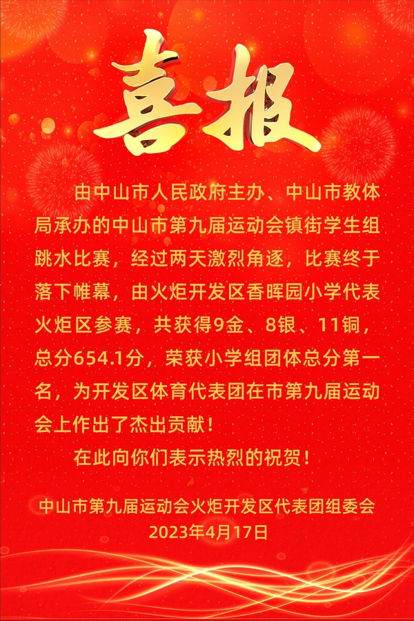 4月15日-16日,中山市第九屆運動會鎮街學生組跳水比賽在中山市體育運動學校進行,本次比賽吸引了來自全市各鎮街運動員參與角逐。開發區香暉園小學游泳隊代表火炬開發區參賽。游泳健兒積極備戰,刻苦訓練,在比賽中發揮頑強拼搏的精神,奮勇爭先,展現了極高的競技水平和良好的精神風貌,最終力壓群雄,共獲得9金、8銀、11銅,榮獲小學組團體總分第一名。
