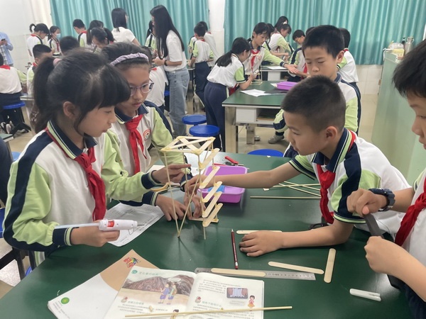培訓(xùn)課程的第一部分是柳樺老師上展示課——《生活中的框架結(jié)構(gòu)》。柳樺老師以項(xiàng)目式教學(xué)理念入手,重構(gòu)了教材內(nèi)容,通過“學(xué)校被認(rèn)定為排球推廣學(xué)?!钡恼鎸?shí)情境來引出“設(shè)計(jì)制作排球裁判臺(tái)模型”的挑戰(zhàn)任務(wù)。讓學(xué)生根據(jù)真實(shí)的裁判臺(tái)圖片自主地提出相關(guān)的模型建造要求,然后依要求進(jìn)行設(shè)計(jì)制作,最后在測(cè)試評(píng)價(jià)過程中借用量化表引導(dǎo)學(xué)生建構(gòu)“利用框架結(jié)構(gòu)可以增加裁判臺(tái)的承重力”“三角形比四邊形的穩(wěn)定性更強(qiáng)”的新知識(shí)。融合項(xiàng)目式教學(xué)理念的科學(xué)課堂,能充分地激發(fā)學(xué)生的創(chuàng)新思維與學(xué)習(xí)熱情,體現(xiàn)了新課標(biāo)中關(guān)注學(xué)生核心素養(yǎng)的教學(xué)理念。