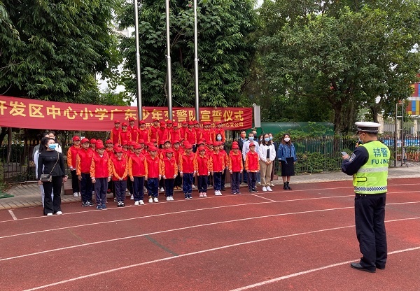 為了切實加強(qiáng)學(xué)生校內(nèi)外交通安全教育,提高少年兒童的交通法規(guī)意識和自我保護(hù)能力,開發(fā)區(qū)中心小學(xué)在中山市公安局和中山市教育和體育局的聯(lián)合部署下,聯(lián)合開發(fā)區(qū)交警大隊成立了一支58人的少年交警隊。少年交警隊的成立是響應(yīng)教育部關(guān)于少年兒童積極參與社會實踐活動的踐行要求,增強(qiáng)學(xué)生的社會責(zé)任感和促進(jìn)學(xué)校交通安全工作的深入開展。開發(fā)區(qū)中心小學(xué)通過班主任老師動員及推薦,學(xué)生自愿報名,家長大力支持下,于10月25日上午在國旗下舉行了少年交警隊宣誓儀式,儀式由少先隊輔導(dǎo)員于景瀟老師主持。