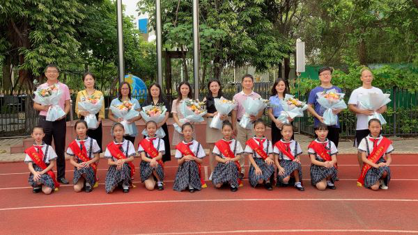 首先,全體師生舉行莊嚴的升旗儀式。現場,全體肅立,伴隨著雄壯的國歌聲,五星紅旗冉冉升起。學校禮儀隊的少先隊員們為教師代表獻花。來自一至六年級級組、藝術科組、體育科組、綜合科組、行政組共10名教師代表接受獻花。來自四(2)班的優秀少先隊員代表陳泳霖同學致辭,表達對全體教師感激之情。最后,全體同學齊唱《聽我說謝謝你》。當2800余名孩子們用稚嫩的聲音齊聲高唱“你是我的天使,一路指引我,無論歲月變幻,愛你唱成歌。聽我說謝謝你,因為有你,溫暖了四季……”溫情的歌聲傳達著孩子們對老師諄諄教誨的無限感激。在這無限感動的一刻,眼眶濕潤著的老師們感到了為人師者的莊重與神圣,欣慰與幸福。