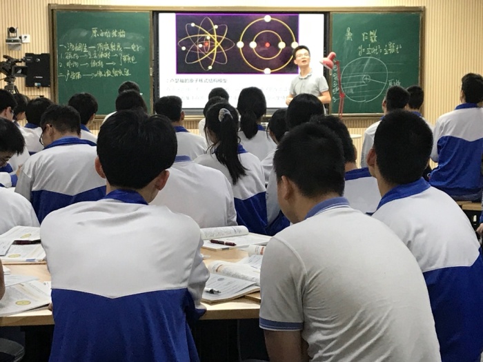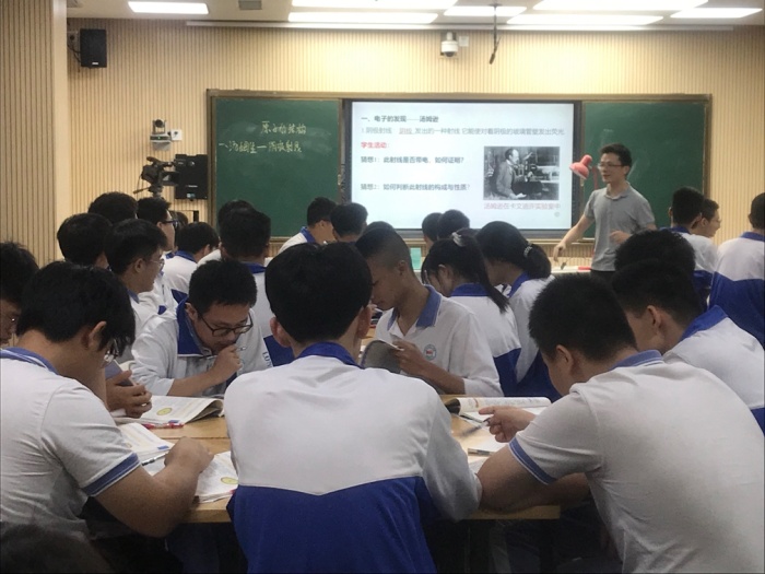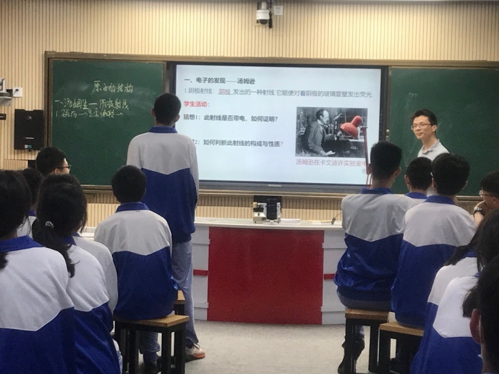 上午第四節,高二年級備課組長張慶生老師在錄播室給高二(2)班學生上了一節主題為《原子結構》的公開課。張老師通過手機投屏的方式向學生清晰地展示了陰極射線在磁場和電場中的偏轉情況,引導學生分析陰極射線的本質,提出原子可分的觀點,而后引導學生思考原子內部的正、負電和質量的分布情況:由猜想模型到理論分析,由實驗觀測到推翻猜想,由建立新的模型到合理解釋實驗現象,環環相扣,嚴絲合縫,尤其是多次三維模擬動畫的展示,對推動課堂的進程、高效達到預設目標提供了極大的幫助。張老師對信息技術手段的嫻熟應用,豐富了課堂教學的方式,激發了學生學習的興趣,大幅度提升了教學效率,達到極好的效果。