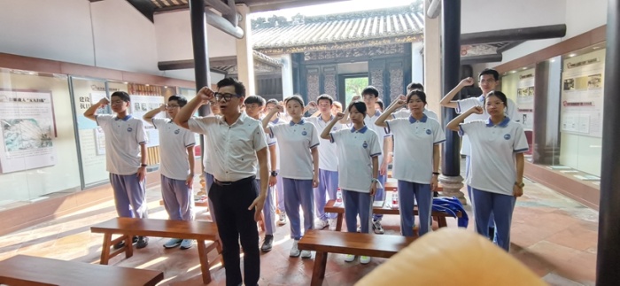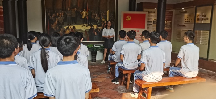 五桂山石瑩橋村山明水秀,綠樹成蔭,曾是中山打擊日寇,以少勝多著名戰例的發生地。這里,記載著先輩勇擔責任,敢于戰斗的英勇事跡。研學小組根據規劃好的路線,首先參觀了珠江縱隊司令部舊址,也稱古氏宗祠,通過觀覽一幅幅圖片、一張張舊物,一段段視頻,了解了英勇的中山人民在中國共產黨領導下所開展抗日斗爭的英雄事跡,感受著他們的頑強不屈和堅定意志。在這蘊含著紅色基因的基地,同學們在莫宗迪主任的帶領下,重溫了入團誓詞;黨辦主任暨課程建設組主持人馬立華老師為大家詳細講解了當年中山的紅色故事;梁天鈞級長帶領同學們激情朗誦了王昌齡《出塞二首·其一》和李清照的《夏日絕句》古詩詞,同學們的愛國之情油然而生。而后,梁業興和劉金蓉級長為學生們分別從數學、地理的角度分析當年中山五桂山人民抗戰時的所運用的知識,引導同學們感受中山人民的智慧,立志更努力學習科學文化知識,將來真正為祖國各項偉大事業添磚加瓦。最后皮益輝級長暨課程建設組成員呼吁同學們賡續紅色文化,弘揚民族精神,爭做先鋒模范,積極向黨組織靠攏,爭取將來早日加入中國共產黨,為共產主義事業,為中華民族偉大復興而奮斗。