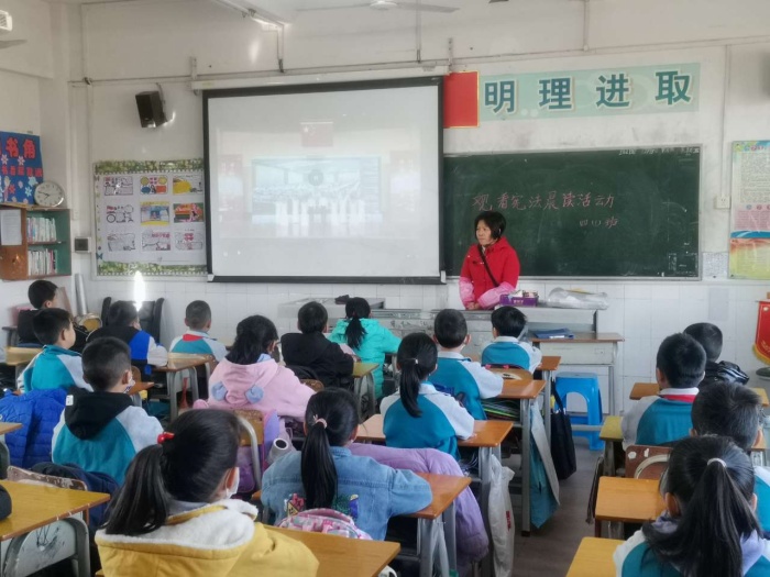 12月3日上午第二節班會課上,教師帶領學生觀看直播“憲法晨讀”,較深刻地了解如何樹立憲法觀念等一系列重要的內容。另外班會課上圍繞國家憲法日主題,以班隊活動形式組織學生集體學習。各班更是結合校情和學生的生活實際開展主題教育;有播放生活中青少年違法案例讓學生參與討論的;有從良好行為習慣的養成談如何做守法好公民的;有結合自身實際交流對憲法條文的認識理解。