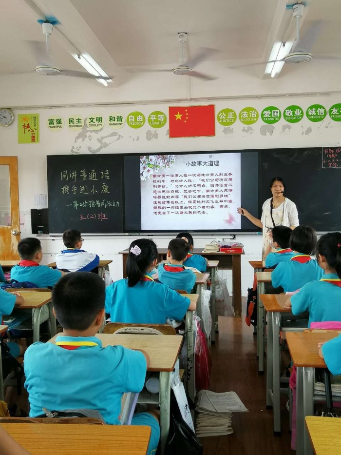 升旗儀式后,各班舉行了推普周的主題班會,讓在校的學生們繼續深化在小說普通話的好習慣。同時,結合學校德育工作的重點之一行為規范訓練,由一年級各班語文老師在班級內對學生進行校園常用普通話培訓,如問候語、文明用語等,形式為教師示范、學生練習、學生互動、師生表演。激發孩子說普通話的興趣,也教給孩子常用的普通話。高年級的同學進行朗誦、繞口令練習等活動。