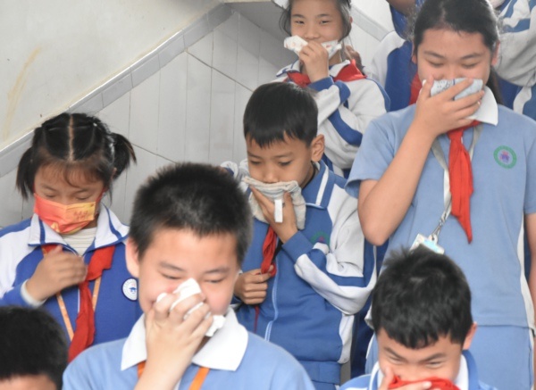 據了解,為了確保演練活動落到實處,學校成立了以陳德亮校長為組長,以安全處鄒濤助理為副組長的演練工作領導小組,小組成員經過會議研討并制定演練活動方案,通過教師會議、班會、課間操進行宣傳動員,明確各自的職責要求。全校師生從思想上引起重視,增強安全應急意識,并抓住這次演練機會,提高應對突發事件的能力。演練前,學校各個部門、各位老師根據演練方案的工作職責各就各位,負責應急疏散地點的指引工作。當廣播響起報警應急疏散信號時,全校學生在老師指導下用濕毛巾或手帕捂住口鼻,彎腰有秩序地迅速撤離。到達目的地,各班班長馬上清點人數,報告校長和主任。然后各班在籃球場、足球場集合。
