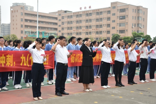 為調(diào)動(dòng)全體八、九年級(jí)師生的工作和學(xué)習(xí)積極性,進(jìn)一步激發(fā)師生的工作、學(xué)習(xí)熱情,更好地備戰(zhàn)中考。3月18日上午,中山市民眾錦標(biāo)學(xué)校在校舞臺(tái)前舉行了“錦標(biāo)學(xué)校2022屆中考百日沖刺誓師大會(huì)”。誓師大會(huì)由教導(dǎo)處助理徐珍主持,校長(zhǎng)陳德亮、常務(wù)副校長(zhǎng)蔣業(yè)轉(zhuǎn)、辦公室主任兼學(xué)校黨支部書記吳良成、德育處副主任徐文亮、安全處助理林觀祥、安全處助理鄒濤、安全處助理陳勝善、辦公室助理冼旺弟、教導(dǎo)處助理高勇、團(tuán)支部書記楊貞磊、少先隊(duì)總輔導(dǎo)員陳燕和八、九年級(jí)全體師生與會(huì)。