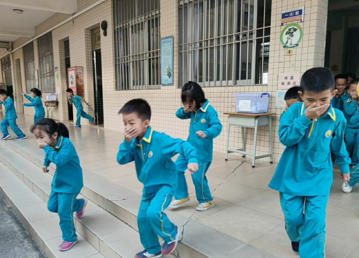 8點整,隨著警報聲響起,各班班主任和科任教師及時準確地組織學生,迅速進入緊急疏散狀態。在老師的帶領下,全體學生彎著腰、貓著步,用手帕、毛巾等捂住口鼻,快速而有序地按預定疏散路線,從“災害現場”逃離,疏散到學校的操場上。1400多名師生訓練有素地從各個室場撤離到學校小操場空地,隨后各班班主任清點人數,匯報給學校安全主任。能如此快速有序地撤離,得益于浪網小學平時對安全工作的重視,師生們在疏散時牢記注意事項與撤離路線。