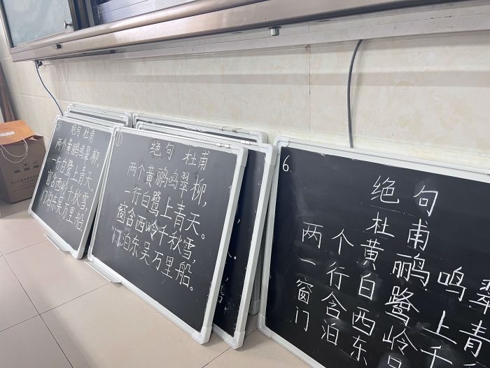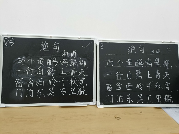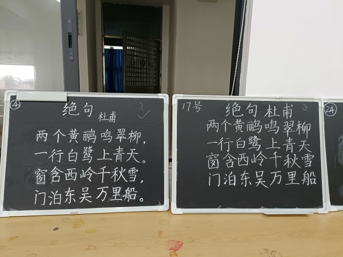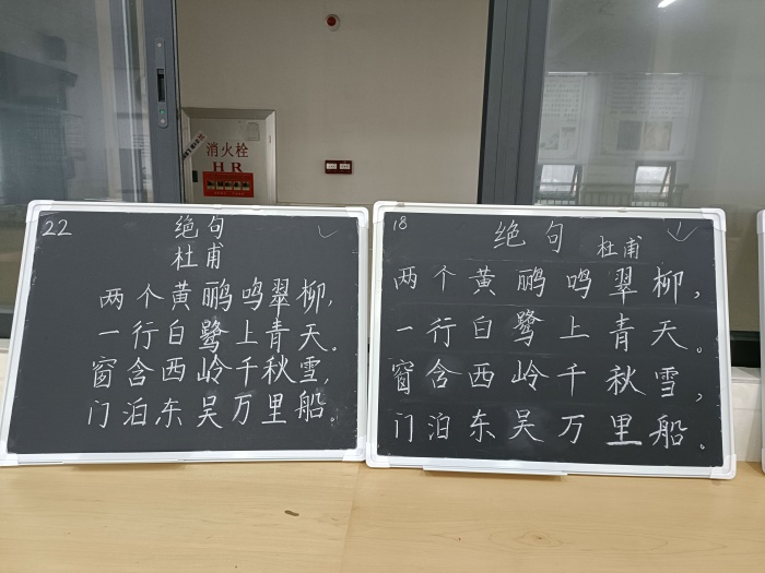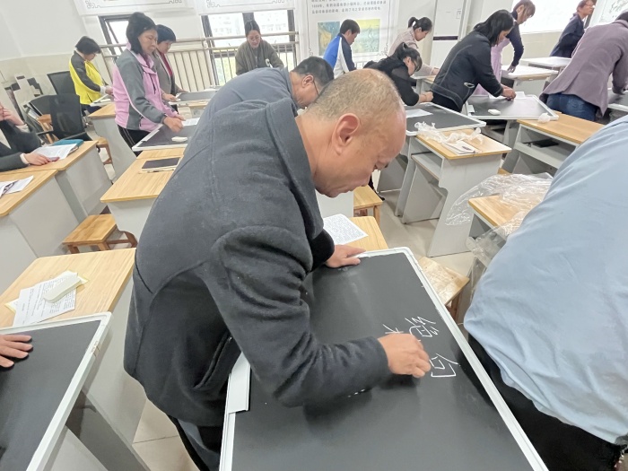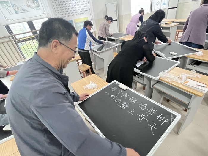 接下來進行粉筆字比賽。粉筆字比賽的內容為中華傳統古詩詞,在指定的比賽地點完成現場書寫。比賽中,老師們全神貫注,凝神運氣,盡情揮灑手中粉筆,寫下一串串或端正、或清秀、或剛勁的字體。