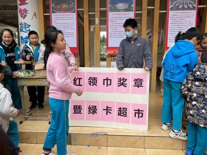 綠卡超市是民眾鎮三民學校少先隊的特色常規活動,用以鼓勵學生積極學習,養成良好的生活習慣、學習習慣。兌換活動每學期進行一到兩次。平時,老師會根據學生在上課學習、衛生保潔、紀律操守、參加各類活動等方面的表現向學生發放綠卡,學生通過長時間的努力,積攢綠卡,在兌換日便可兌換各種精美的禮品,也可以積累兌換紅章,再以紅章兌換一枚最高獎勵的金章。2021年12月28日,民眾鎮三民學校舉行了本學期第二次“綠卡超市”兌換活動。