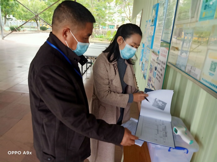 檢查組還走進(jìn)相關(guān)室場(chǎng),查看資料的完備與否、制度的落實(shí)情況等,如門(mén)衛(wèi)室的出入登記,教室的測(cè)溫登記、消毒記錄、突發(fā)事件的處理記錄等。