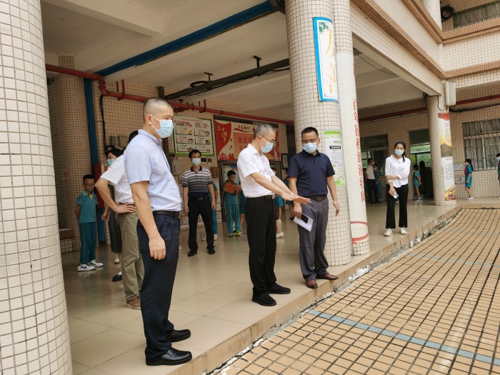 黃聲群主任一進校門就詳細詢問了學校開學疫情防控的相關情況。胡留全校長把教職員工、學生及同住人粵康碼、行程卡和智立方申報表收集情況,校門口值日及測溫安排,應急處理流程等向黃聲群主任作了匯報。