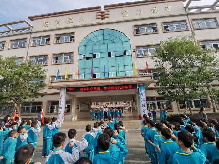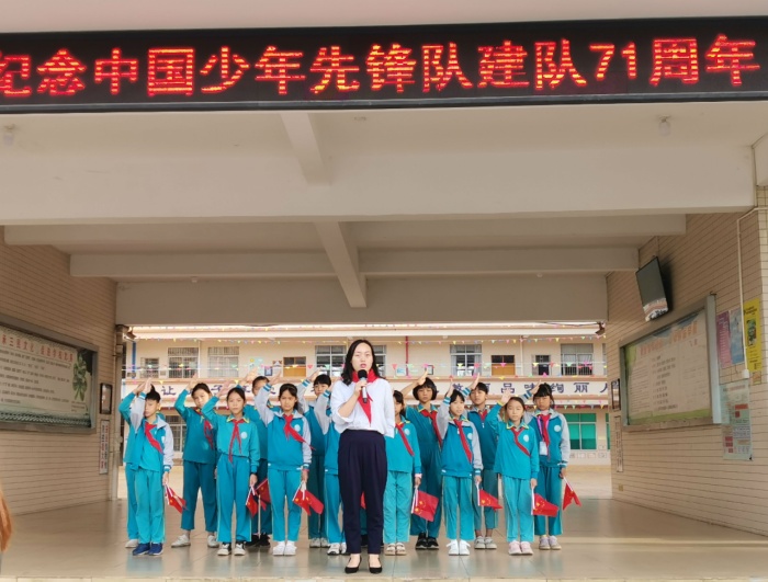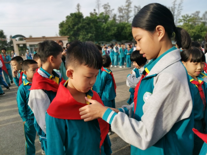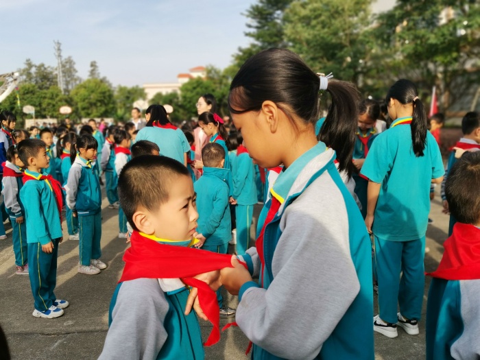 決定宣布之后,老隊員們為新少先隊隊員佩戴了鮮艷的紅領巾。大堂前,全體少先隊員們在鮮艷的隊旗下莊嚴宣誓:“時刻準備著”,表明為共產主義事業貢獻力量的決心。最后,三民學校少工委主任林西仙校長表達了對新隊員真誠的祝福和對全體少先隊員們殷切的希望。