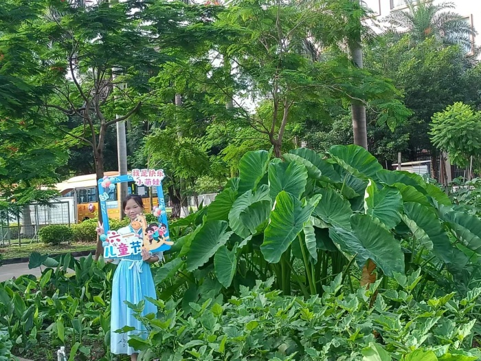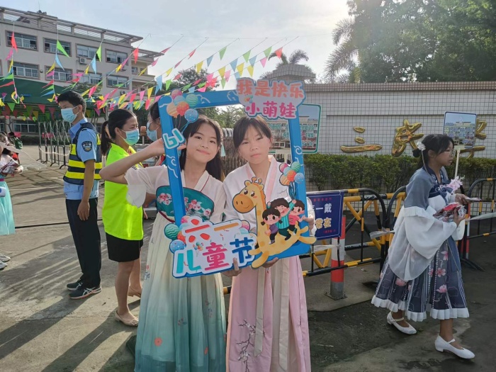 早上7點,少先隊員身穿漢服手舉精美拍照相框在校門口送歡樂,讓學生進入校園的這一刻就能感受到歡樂輕松的“六一”氛圍。