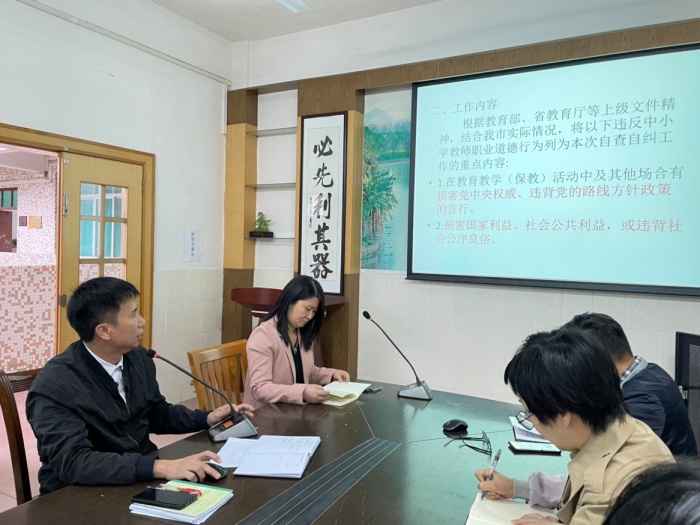 本次主題會,首先由陸銳勛校長組織學習《中山市教育和體育局關于開展師德師風自查自糾工作的通知》。接著,德育處陳福有主任就《新時代中小學教師職業行為十項準則》《廣東省中小學幼兒園教師違反職業道德行為處理工作指引》的一些綱要進行了組織學習。最后,支部書記陸銳勛同志特別強調,意識形態是學校工作的重要組成部分,教師們應該以身作則,在政治上要與黨中央保持一致,在生活中要傳遞正能量,在工作中要不忘初心的為社會主義建設培養人才。