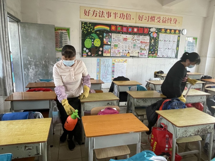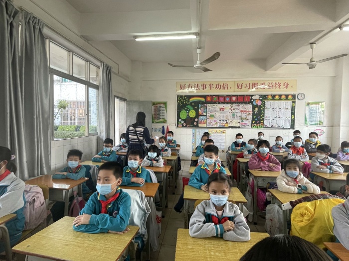 下午3點45分,演練正式開始,陸銳勛校長為本次演練的總指揮;本次分為三個主要演練內容,第一:師生進校演練;師生佩戴好口罩,有序地間隔1米排隊依次測溫進校。如發現學生體溫異常,應急處置老師聯系衛生應急處置員,衛生應急處置員將體溫異常的學生帶到隔離室復測體溫,體溫是異常的應致電班主任,并按衛生應急處置員按流程規范進行處置。第二:上課出現異常應急演練;班主任對學生詢問“三史”,確認無異常后準備上課。如有學生舉手報告身體不舒服,上課老師安排好其他學生自學任務后,給報告者測體溫,體溫異常的致電梁兆元主任,班主任相隔1米,帶學生到留觀室,衛生管理員按流程規范進行處置。然后班主任對全班學生逐一進行體溫檢測,確認均無異常后,帶領學生由疏散專用通道離開,到備用課室。同時通知消毒員對課室及專用通道進行消毒處理。第三:師生核酸采樣演練:如校內發生不明來源新冠病毒肺炎本土病例或密切接觸者時,需開展全員新冠病毒核酸采樣。班主任組織學生分四列,分別站在臨時觀察區兩側依次檢測,每組檢測10人,檢測完成后學生直接回教室。
