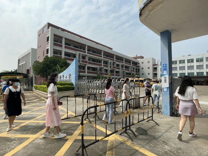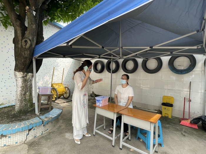 演練正式開始,梁文輝校長為本次演練的總指揮;本次分為三個主要演練內容,第一:師生進校演練;師生佩戴好口罩,有序地間隔1米排隊依次測溫進校。如發現學生體溫異常,應急處置老師聯系衛生應急處置員,衛生應急處置員將體溫異常的學生帶到隔離室復測體溫,體溫是異常的應致電班主任,并按衛生應急處置員按流程規范進行處置。第二:上課出現異常應急演練;班主任對學生詢問“三史”,確認無異常后準備上課。如有學生舉手報告身體不舒服,上課老師安排好其他學生自學任務后,給報告者測體溫,體溫異常的致電張容冰主任,班主任相隔1米,帶學生到留觀室,衛生管理員按流程規范進行處置。然后班主任對全班學生逐一進行體溫檢測,確認均無異常后,帶領學生由疏散專用通道離開,到備用課室。同時通知消毒員對課室及專用通道進行消毒處理。第三:師生核酸采樣演練:如校內發生不明來源新冠病毒肺炎本土病例或密切接觸者時,需開展全員新冠病毒核酸采樣。班主任組織學生分四列,分別站在臨時觀察區兩側依次檢測,每組檢測10人,檢測完成后學生直接回教室。