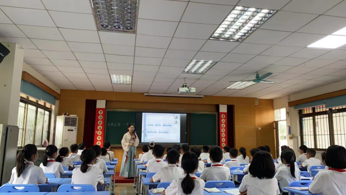 育才小學林丹鳳老師給師生帶來課例活動《聲律啟蒙·一東節選》,她首先給學生講解平仄符號,吟誦古文;隨后引導學生帶著美好的想象去誦讀,從抽象的文字到形象的畫面,這給學生提供了學習創作的基礎。最后,她讓學生從吟誦中感受《聲律啟蒙·一東節選》的意境美、對仗美、韻律美。