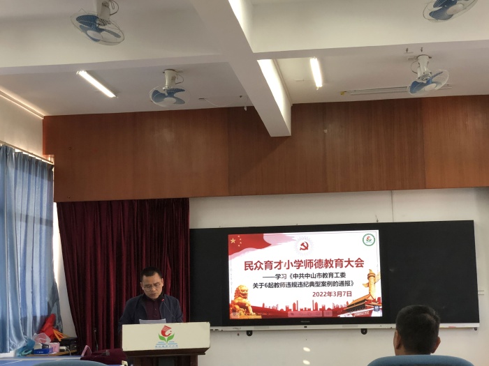 隨后,由胡留全校長帶領全體教師召開了“學習《中共中山市教育工委關于6起教師違規違紀典型案例的通報》”的師德教育大會。胡留全校長強調,這6起案例引人深思,令人警醒,希望全體教職工通過對這6起“典型問題”的學習,引以為鑒,時刻守住廉潔從教這根底線。