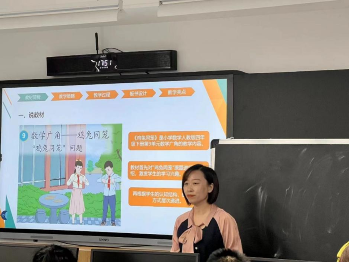 彭蓉老師的說課分為教材簡析、教學(xué)策略、教學(xué)過程、板書設(shè)計(jì)、教學(xué)亮點(diǎn)五個(gè)環(huán)節(jié),以親切自如的教態(tài)和富有感染力的語言,思路清晰、重點(diǎn)突出地呈現(xiàn)了《雞兔同籠》的課堂,展示了育才小學(xué)數(shù)學(xué)教師的教學(xué)素養(yǎng)。