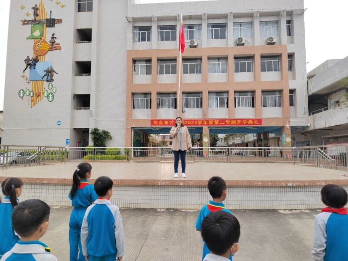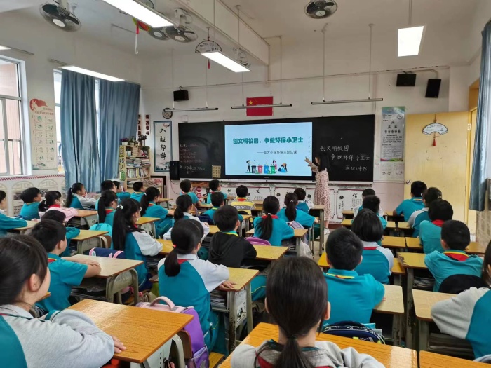 然后,由楊幫科主任在全校師生面前做全體動員。楊主任在講話中既提出對學(xué)生的要求,又強(qiáng)調(diào)了教師以身示范的作用。她要求全體師生要有主人翁意識,注意文明禮貌,提高環(huán)保意識,為中山市創(chuàng)建全國文明典范城市助力。