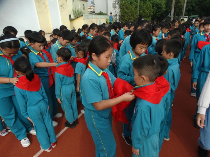 10月23日下午,伴隨著嘹亮的出旗曲,少先隊員和護旗手們邁著整齊的步伐出場,莊嚴的入隊儀式由此開始。紅領巾代表紅旗的一角,是革命先烈的鮮血染成的。佩戴上鮮艷的紅領巾,是光榮,也是一種責任。隨后,《紅領巾相約中國夢》的樂曲響起來了,老隊員代表們為新隊員佩戴紅領巾,在鮮艷隊旗的引領下,在星星火炬的照耀下,新隊員們將帶著美麗的夢想揚帆啟航!