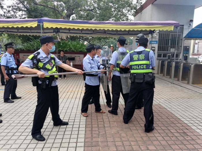 會后,在總務處的組織下,全體保安人員還進行了實操演練。首先,對各種的防暴器械重新學習正確的使用方法。然后,對身份證錄入系統進行訓練。經過了一輪操作訓練后,學校的報警鐘響起,打通110電話后,五分鐘之內,欖邊派出所的五名警察收到報警電話立刻趕到了欖邊小學。欖邊派出所伍世通所長耐心指導保安人員的防暴動作,并實地模擬示范“擒賊”技巧,欖邊小學的保安人員全神貫注地聽,認真地練習,掌握了如何在危急情況下使用防暴器械以及如何快速制服暴徒新的技巧。