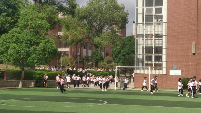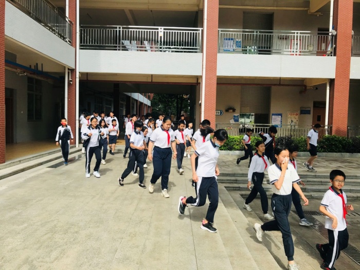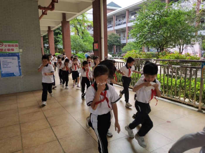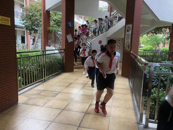 上午9:10,隨著警報的響起,班主任老師迅速到達(dá)班級,協(xié)助上課老師一起組織學(xué)生疏散,其他老師們也在第一時間趕到自己當(dāng)時所在樓層拐角、人流比較多的地方,配合疏散學(xué)生。各班學(xué)生在老師們的指揮下,按照指定路線,彎著腰,用手、紙巾捂著嘴鼻迅速有序地進(jìn)行緊急疏散。全體師生撤離到安全地帶,用時不到三分鐘。