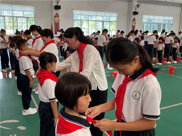 接下來,是萬眾期待的入隊(duì)儀式了。當(dāng)學(xué)校少工委副主任易思宣布新隊(duì)員名單時(shí),隊(duì)員們都不約而同地驕傲又自豪地站起來,接受學(xué)校少工委主任、輔導(dǎo)員老師以及六年級(jí)隊(duì)員授予的紅領(lǐng)巾。當(dāng)鮮艷的紅領(lǐng)巾飄揚(yáng)在胸前時(shí),新隊(duì)員臉上不由自主地洋溢著陽光般的笑容。二(2)中隊(duì)彭欣妍隊(duì)員還代表新隊(duì)員發(fā)表講話,彭欣妍同學(xué)向培育自己的輔導(dǎo)員老師表示了感謝,還為終于加入了少先隊(duì)而感到自豪,表示一定會(huì)牢記習(xí)爺爺?shù)膰谕?,?jiān)定理想信念,奮勇向前,為胸前的紅領(lǐng)巾增光添彩。