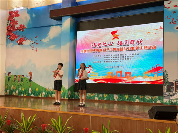 為學(xué)習(xí)宣傳習(xí)近平總書記“七一”重要講話精神,引導(dǎo)少先隊(duì)員們用實(shí)際行動(dòng)踐行“請(qǐng)黨放心,強(qiáng)國有我”的錚錚誓言,在中國少年先鋒隊(duì)建隊(duì)72周年紀(jì)念日之際,南朗街道黨工委、南朗街道團(tuán)工委、南朗街道翠亨小學(xué)少工委于10月14日在翠亨小學(xué)舉辦“請(qǐng)黨放心 強(qiáng)國有我”——南朗街道少先隊(duì)建隊(duì)日主題活動(dòng)。