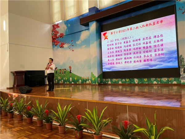 南朗街道黨工委委員張仁亮發(fā)表講話。張委員向今天加入少先隊(duì)的隊(duì)員們表示了衷心祝賀,還勉勵(lì)隊(duì)員們要在星星火炬的指引下,在黨的陽光照耀下,學(xué)習(xí)做人、學(xué)習(xí)立志、學(xué)習(xí)創(chuàng)造,為祖國的繁榮發(fā)展貢獻(xiàn)力量。