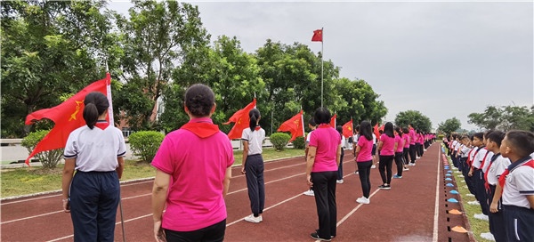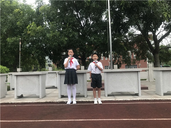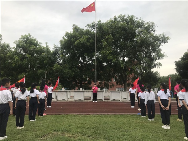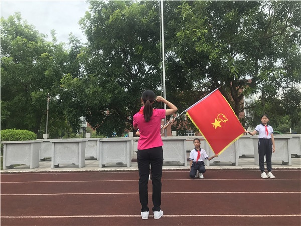 嘹亮的國歌聲奏響了活動的第一議程,全體少先隊員敬禮,向國旗致敬。緊接著,大隊干部踏著矯健的步伐,出大隊旗。國旗和隊旗迎風飄揚,全體少先隊員在國旗和隊旗下唱響隊歌。