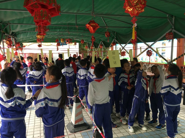 看!橫門小學剛進校門處懸掛著精美的花燈。據悉,這些花燈是學生們在家變廢為寶制作出來的,精美且環保,非常有創意。在德育處的組織下,各個班級分別進行猜燈謎的活動。五彩的燈謎懸掛在花燈下,“半青半紫。(打一字);鳳凰臺上鳳凰游 (打數學名詞一)……”每個燈謎都那么好玩有趣。孩子們穿梭于花燈間,猜出來的,歡呼雀躍;猜不出的,緊皺眉頭。