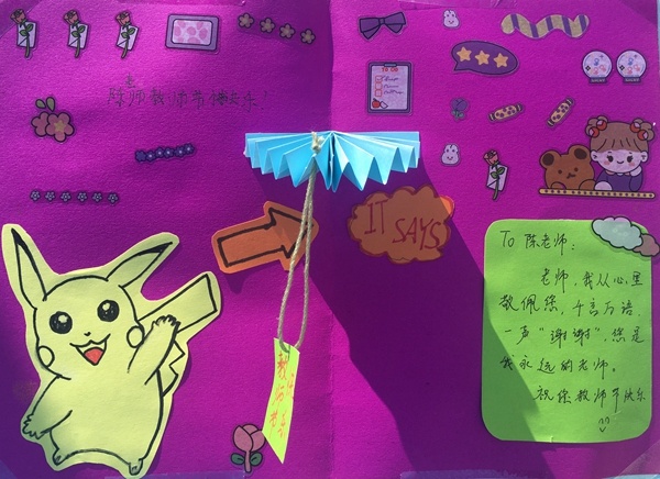 接著少先隊員代表們向教師送上自己親手制作的賀卡、繪畫,并祝福老師們節日快樂!