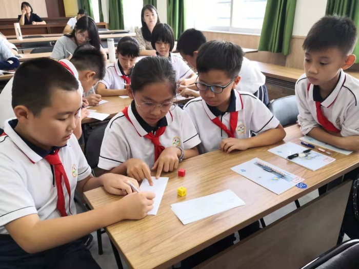 首先由五年級組楊素卿老師進行課例展示《擲一擲》拉開序幕。課堂上楊老師主要滲透“快樂學習——猜想預測——游戲驗證——得出結論”這一學習方法。從學生最喜歡的游戲引入,貫穿整節課,課堂上楊老師讓學生通過大膽預測,游戲、觀察、比較和分析,得出規律,整節課楊老師循循善誘,溫柔睿智,用她獨特的風采引領學生在游戲中探索,課堂氣氛活躍有序,學生認真積極地參與學習。在老師的引領下,學生通過小組合作,相互交流討論等各種方法自己探索,由感性逐步發展到理性,合理地構建知識獲得新知,激發學生的學習興趣。